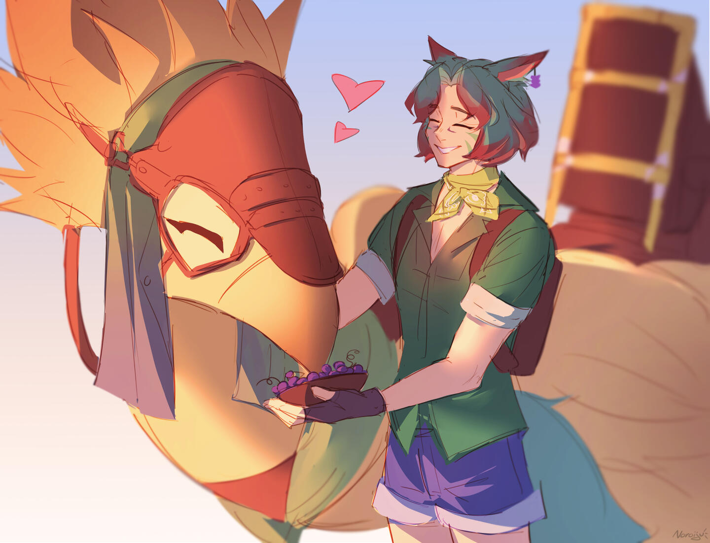 Avi was shipped to live with his Aunt and Uncle in Limsa once Doma had fallen to Garlemald. He spent his younger years as an arcanist in which his poor control over aether caused him to have constant conflicts with his family. Who expected him to be just as attuned as the rest of his family supposedly was. After a particularly heated argument, around the age of 14, Avi just took off into the night and began working anywhere that would pay him or give him a roof over his head and food in his belly. It was once he took up Chocobo farming that Avi found his love and assumed that's what he wanted to do for the rest of his days. Though there was one who was said to be stubborn and mean towards any potential rider or caretaker. Avi's stubbornness coming through - took it as a challenge and spent weeks getting pecked, sleeping in the stables with Paprika, and attempted riding many times before Paprika finally began warming up to Avi. As months passed, the birds were all taken by Maelstrom to be used as Calvary. Avi, not keen on losing a bird that he loved, joined up and began serving in scouting missions with Paprika. Avi would spend the rest of his days in service to Maelstrom doing all manners of scouting, assassination, envoy, bodyguarding, and even acting as a samurai in Kugane in a means to improve relations between the countries where his skills as a dagger wielder improved and he learned the arts of Ninjutsu